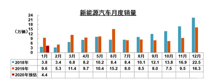 根据中汽协数据显示:2020年1月,乘用车产销预计分别完成144.4万辆和161.4万辆,环比分别下降33.9%和27.1%,同比分别下降27.6%和20.2%。其中,新能源汽车方面,1月产销预计分别完成4.0万辆和4.4万辆,同比分别下降55.4%和54.4%。