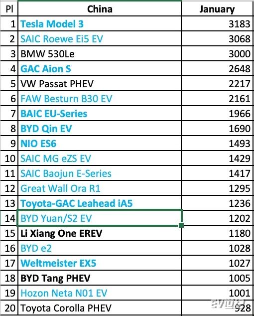 近日,新能源汽车媒体insideEVs公布的车型销量数据显示,特斯拉Model3、上汽荣威Ei5和华晨宝马530Le包揽了1月销量排行榜的前三名。