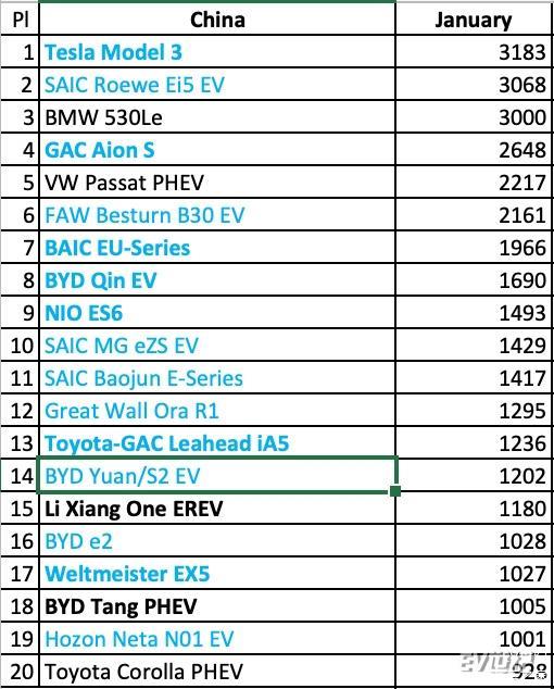 1月国内新能源车销量排行 Model 3/荣威Ei5/BMW 530包揽前三 【图】