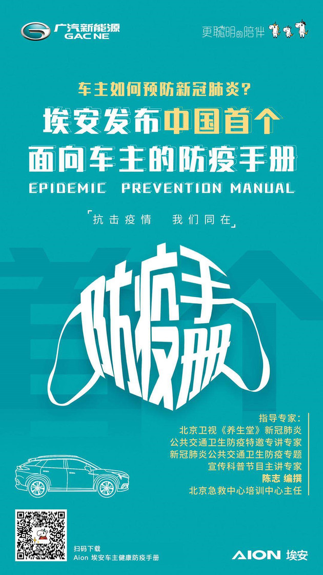 2月19日,广汽新能源特邀北京急救中心培训主任、新冠肺炎防疫专家陈志指导编撰中国首个车主防疫手册——《Aion(埃安)车主健康防疫手册》,对汽车防疫和出行防疫进行全面科普与