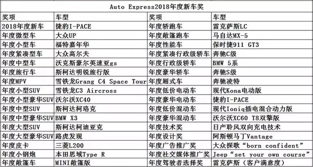 很多人或许没听过AutoExpress,它是英国有名的汽车媒体,与德国的AutoBild、法国的AutoPlus属同一出版社,其一直致力于打造最具有公信力的汽车媒体,本次的年度新车榜单涉及了技术、安全、性能、经济、设计等多方面的评估考察,在英国的含金量首屈一指,对于我们来说也有一定的借鉴意义。
