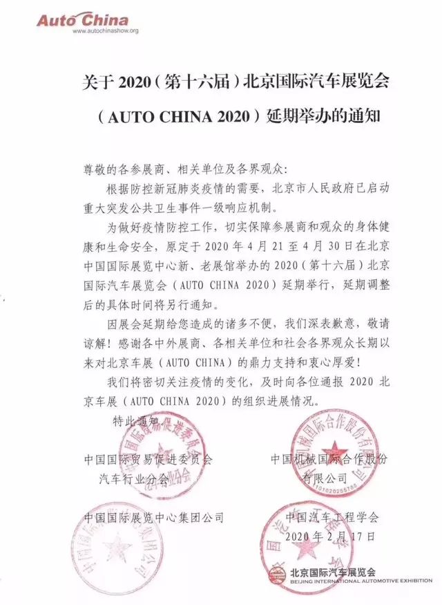 2月17日,北京国际汽车展览会主办机构官方宣布,根据防控新冠肺炎疫情的需要,原定于4月21至4月30日在北京中国国际展览中心新、老展馆举办的2020(第十六届)北京国际汽车展览会(AUTOCHINA2020)延期举行。