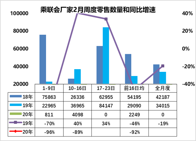 根据乘联会公布的数据,2月第一周国内乘用车市场处于冰封状态,日均零售仅811台,同比下跌96%;第二周有所提升,日均零售4098台,同比下跌89%,综合来看2月前两周的乘用车零售销量跌幅达到了92%。乘联会预计2月的整体销量降幅将在70%左右,1-2月累计销量降幅在40%左右。