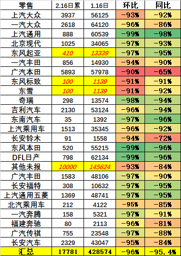 另一份主流车企2月前两周销量数据则更直观地展示了各家的销售情况有多惨烈,环比和同比的跌幅几乎都在90%以上,很多企业两周的累计销量只有几百台。
