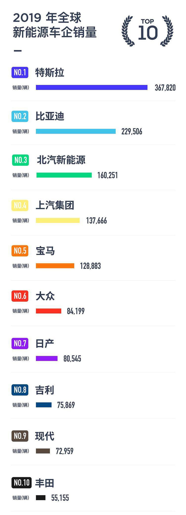 根据报表显示,2019年,特斯拉以 36.7万辆击败比亚迪,成为排名排在首位的新能源厂家。而比亚迪、北汽新能源、上汽集团则分别以 22.9万辆、16.02万辆和13.7万辆排在第二、第三和第四名。