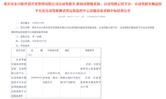 3月17日,百度Apollo中标重庆永川区“西部自动驾驶开放测试基地”建设项目,项目金额为5280万元。百度作为国内唯一具备自动驾驶车、路、云、图全栈能力的公司,入选该项目的单一采购供应商。