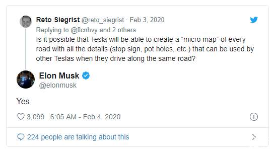 上周,有用户在推特上向特斯拉咨询,特斯拉未来有没有可能创造一张包含如路边警示牌、道路坑洼等所有细节的高精地图,并且可以共享给行驶在这条道路上的其它特斯拉?马斯克对此回复到”yes“。看来,特斯拉很可能会利用高精地图来帮助Autopilot更精确地驾驶。