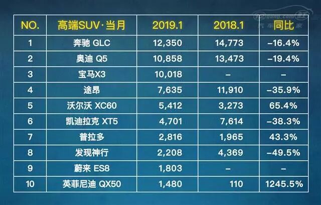 送走残酷的2018年,国内汽车市场又面临着新一轮的挑战,各大车企纷纷交出自己的月考成绩,无论是车企还是民众都对此充满期待。近日,乘联会公布了1月份高端SUV销量排行榜,在严峻