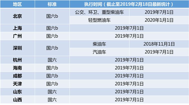 部分地区最新国六执行时间(截止至2019年2月18日)