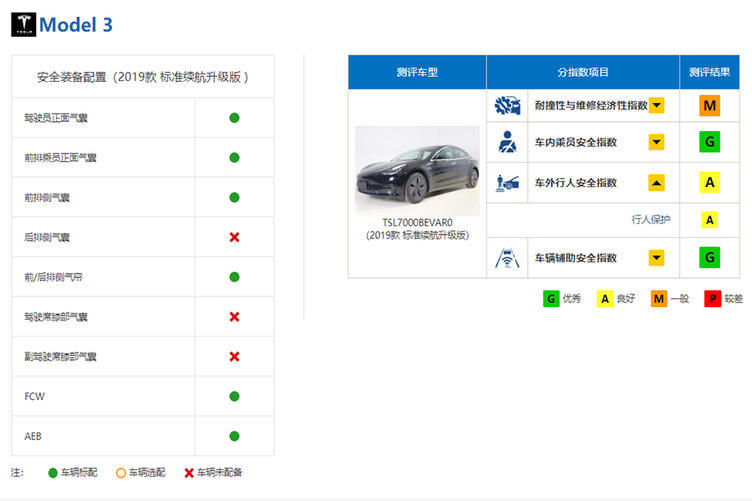 此次参与碰撞测试的是2019款特斯拉Model3标准续航后驱升级版车型。从碰撞结果来看,国产特斯拉Model3的碰撞性与维修经济性指数获得了M(一般)评分,车外行人安全指数获得A(良好)评分,在车内乘员安全指数、车辆辅助安全指数上都获得了G(优秀)评分。