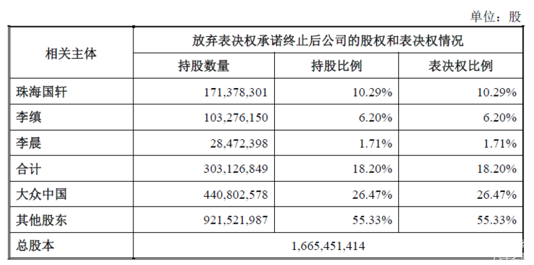 根据《股东协议》的约定,大众中国承诺,自本次非公开发行和股份转让涉及的国轩高科相关股份均登记至大众中国名下起36个月内或大众中国自行决定的更长期间内,其将不可撤销地放弃其持有的部分公司股份的表决权,以使大众中国的表决权比例比创始股东方(珠海国轩、李缜及其一致行动人李晨)的表决权比例低至少5%。
