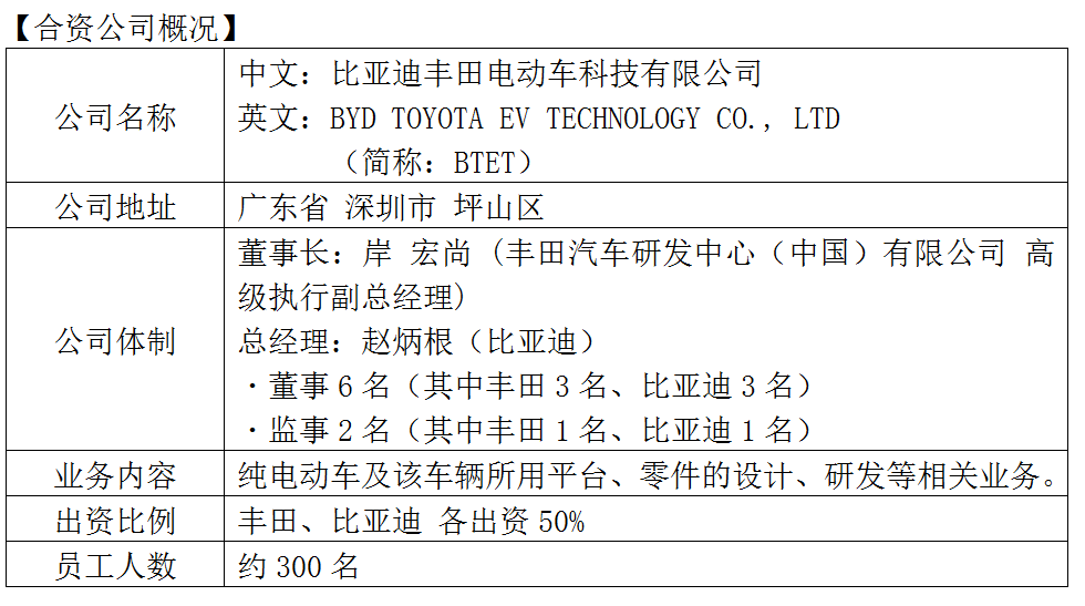 日前讯,丰田汽车公司(以下简称“丰田”)与比亚迪股份有限公司(以下简称“比亚迪”)合资的纯电动车研发公司——比亚迪丰田电动车科技有限公司(以下简称“合资公司”)正