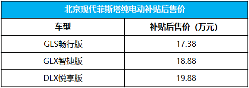 北京现代菲斯塔纯电动补贴后售17.38万-19.88万元 目前续航最长的合资纯电轿车